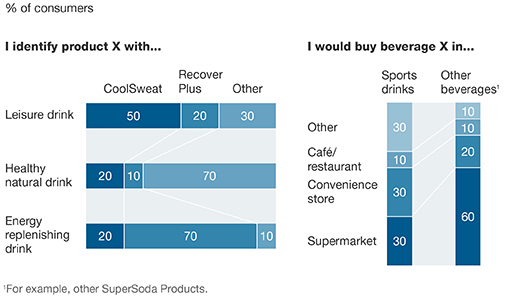 Branding should emphasize “healthy natural” identity. “Leisure drink” identity is dominated by CoolSweat product, “energy replenishing” by RecoverPlus, and “healthy natural” fragmented in other products. There is a clear niche within the “healthy natural” identity, with top-two brands currently occupying only 30 percent of share of mind. “Healthy natural” branding should also determine thinking around the sales channels (for example, sales through health and nutrition outlets, health aisles at supermarkets).
