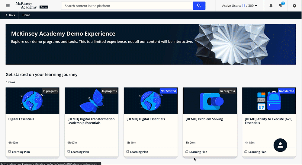 Learning plans include self-guided program modules, which contain lessons on various topics and interactive content.