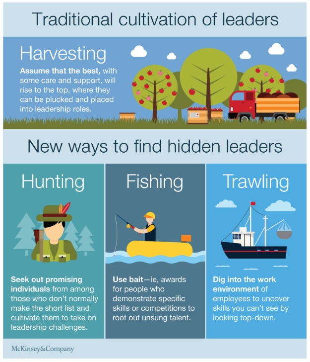 Nada dito aqui pretende substituir o trabalho fundamental de desenvolver a liderança – notadamente um modelo de liderança bem definido, sistemas de gestão da performance de ampla adoção, e o apoio, feedback, oportunidades de desenvolvimento, treinamento, coaching da liderança, encorajamento e conversas difíceis que os grandes líderes trazem para seu cargo. As três abordagens sugeridas aqui – caçar, pescar e trazer à tona – devem ampliar as atividades existentes e podem ser usadas em conjunto com outras ou de forma independente. Líderes organizacionais devem primeiro considerar o que é culturalmente aceitável e tecnologicamente viável, e, em seguida, testar diferentes abordagens e aprimorá-las à medida que forem aprendendo.