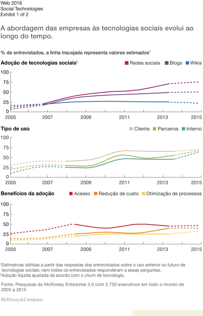 A extensa pesquisa da McKinsey sobre o uso de tecnologias sociais pelas empresas fornece uma vantagem única ao analisar a natureza e o ritmo desta evolução. Pesquisas com mais de 2.700 executivos globais ao longo dos últimos 10 anos comprovaram a disseminação da tecnologia entre as organizações e os padrões para adotá-la.1