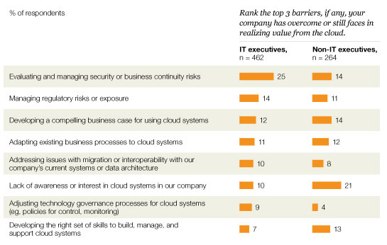 Yet that anticipated expansion faces a few hurdles, and the responsibility falls upon IT leaders to surmount them. When we asked about barriers to cloud adoption, IT and non-IT executives raise a number of significant issues (Exhibit 8). Non-IT executives are most concerned about a lack of organizational awareness, a barrier that ranks higher than security concerns. This underscores leaders’ belief that the cloud can drive substantial value and that the potential risks are manageable.
