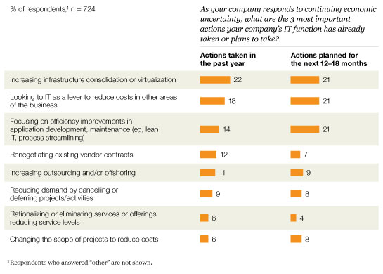 The somewhat better news for those managing IT is that pressure to slash costs while simultaneously responding to these threats has eased somewhat. Respondents report that IT is becoming more than a simple cost center in the minds of many executives. Compared with earlier surveys, a smaller share—23 percent—say IT’s primary contribution to the corporation is in delivering IT services at the lowest cost, down from 25 percent in 2009 and 33 percent in 2008. Instead, more IT and non-IT executives are expecting IT to help drive broader business efficiency (39 percent) and differentiated performance (21 percent) this year. These expectations are reflected in executives’ beliefs about current IT priorities for their organizations: two of the top three priorities center on using IT to improve business performance (Exhibit 2).