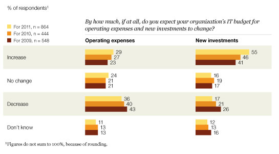 The silver lining to all of this discipline is that companies remain committed to investing in new IT capabilities. To grow the business and counter technology-based threats, 55 percent of executives indicate that their companies will be increasing new IT investments in 2011. Eighteen percent expect an increase of more than 10 percent, while fully a third of respondents expect these investments to increase by 6 percent or more.
