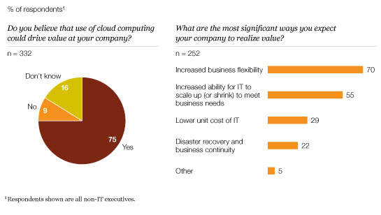 In recent years, IT executives have also focused more attention on cloud computing.2 Our results show that this interest in potential benefits is spreading to business leaders, with the cloud’s promise of increased agility a particularly attractive feature (Exhibit 6).