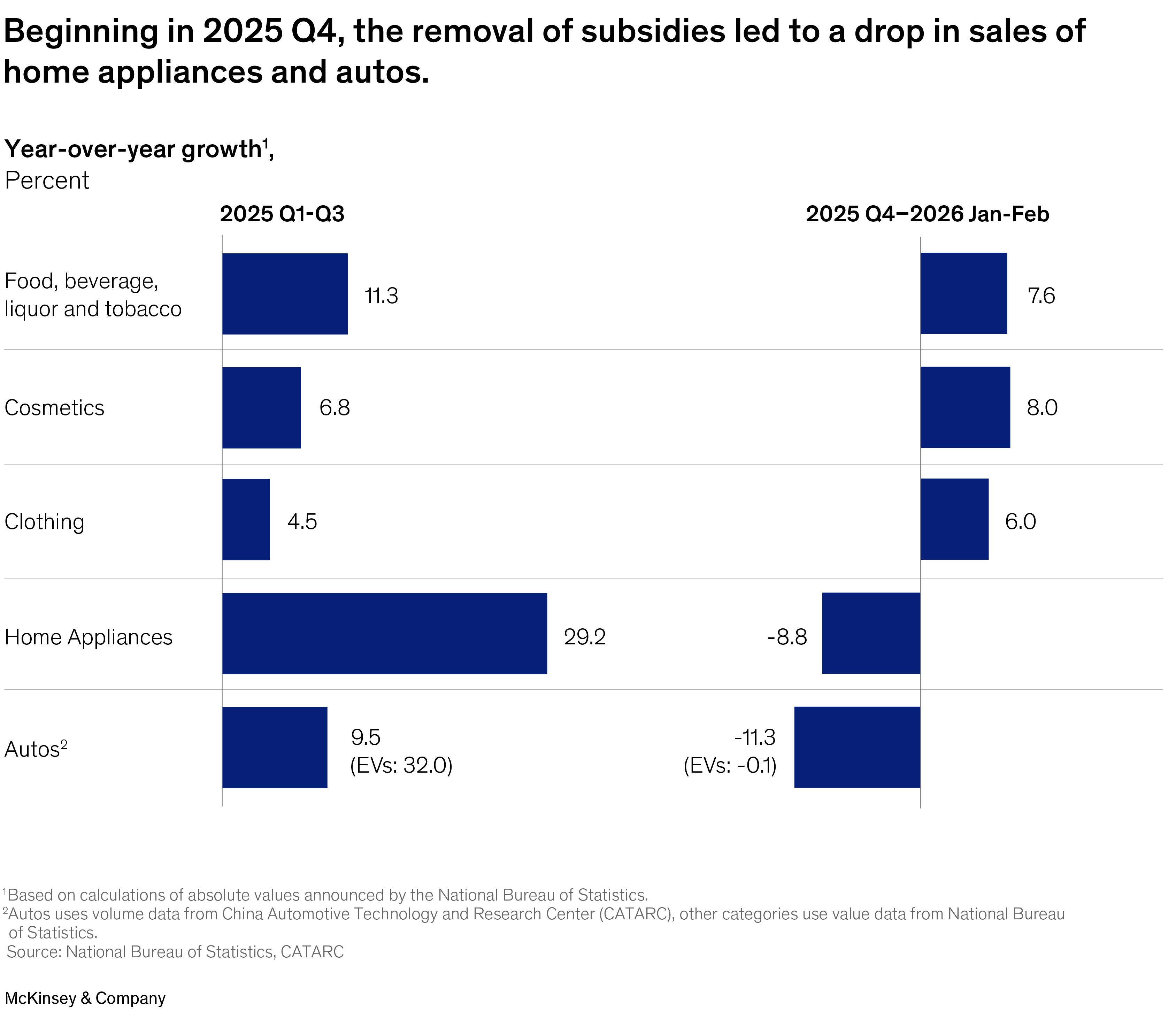 The growth story of the past several months stands in stark contrast to what drove consumption in the first three quarters of 2025. During that period, electric vehicles and home appliances surged on the strength of government demand subsidies—with EVs growing 32 percent and appliances growing nearly 29 percent. That growth was powerfully supported by those subsidies, which are now being phased out.