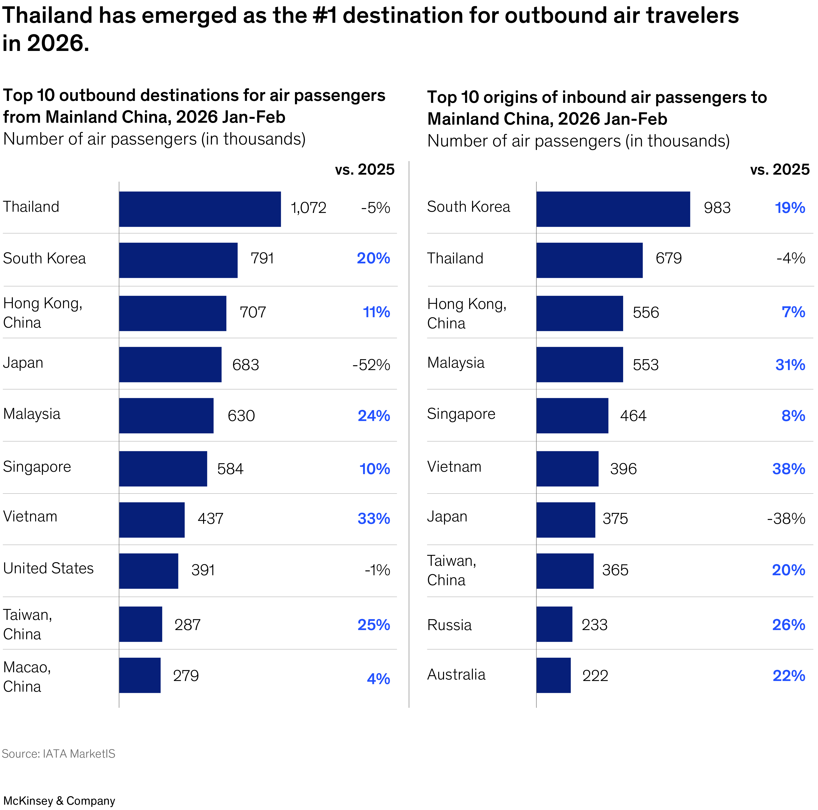 One notable exception to the broader trend of growing connectivity is Japan. Travel between China and Japan has declined sharply in both directions, reflecting the impact of recent diplomatic tensions. Outbound Chinese travelers to Japan fell by roughly half compared with the same period last year— from approximately 1.4 million to around 700,000 in January–February 2026. Japan’s total inbound visitor numbers have nonetheless held steady, with South Korean and Taiwanese travelers stepping in as the top two source markets. Japanese outbound travel has also reoriented: South Korea has become the primary destination, followed by the United States, with double-digit growth in both. For China, the reduced Japan travel appears to have redirected visitors toward other markets in Southeast Asia.