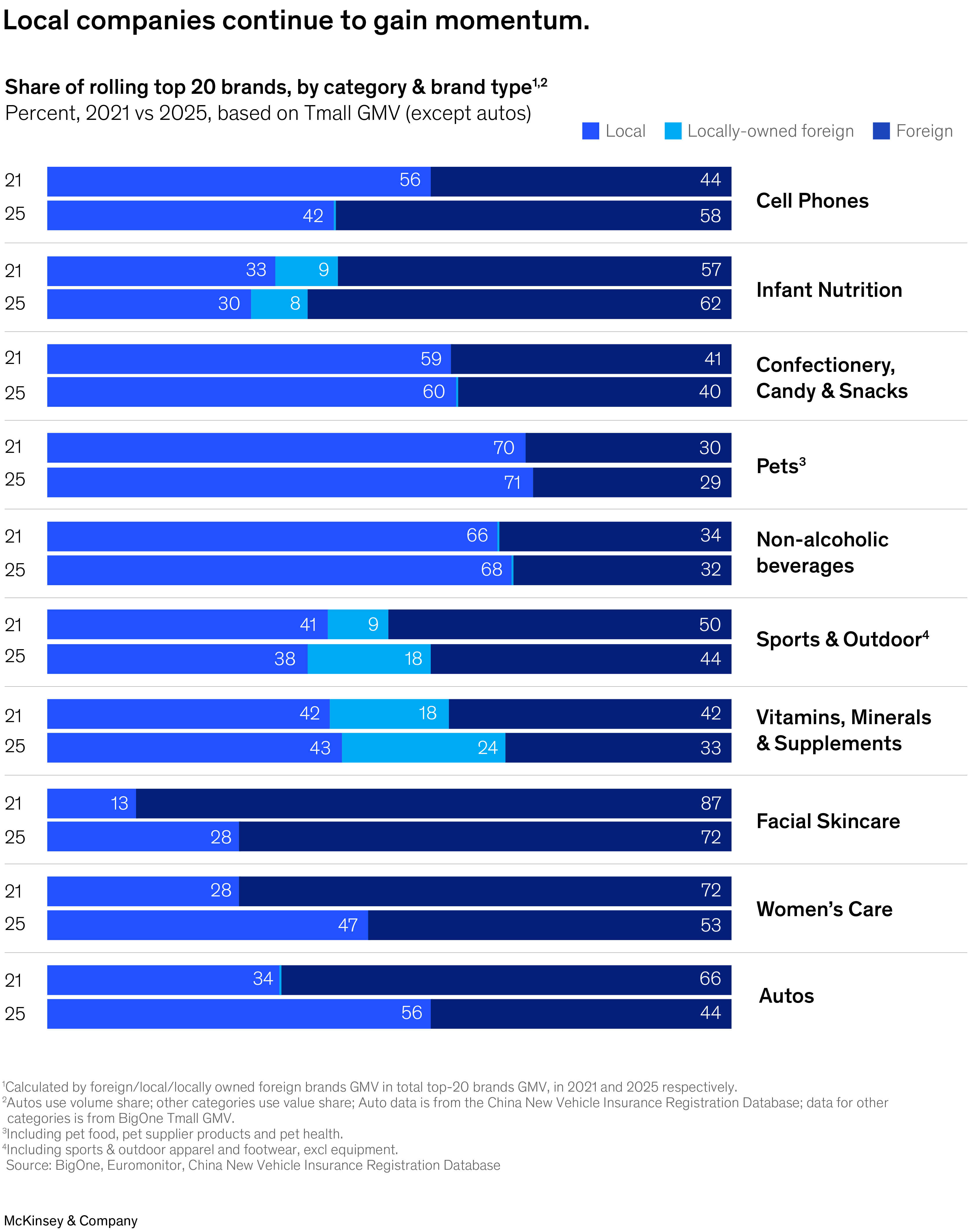 Across most major consumer categories, local Chinese brands have expanded their share at the expense of foreign players. An analysis of the rolling top-20 brands by category tells a consistent story: from confectionery, candy & snacks to facial skincare, from non-alcoholic beverages to sports & outdoor, from infant nutrition to women’s care—local brands have gained ground, sometimes dramatically, between 2021 and 2025. (Exhibit 4)