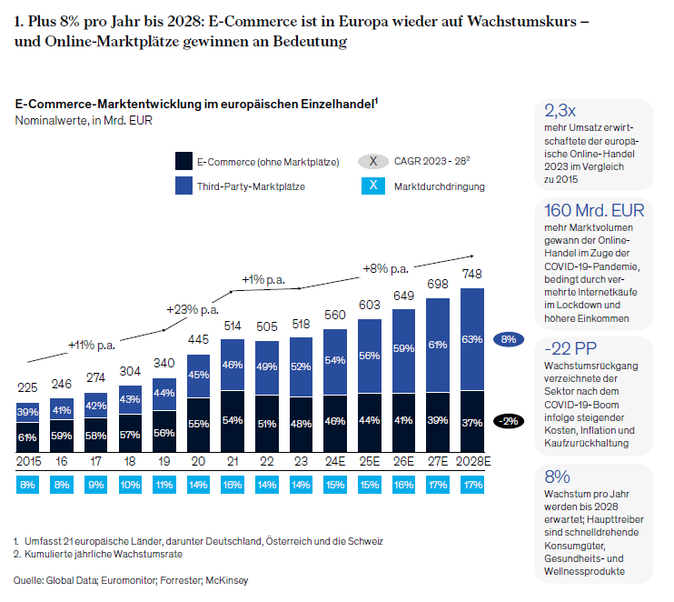E-Commerce, der große Wachstumstreiber: 2022 wäre das noch eine gewagte These gewesen, denn die Zeit nach COVID brachte erst einmal Ernüchterung. Während der Pandemie hatte es der europäische Online-Handel noch geschafft, binnen 24 Monaten sein Wachstum um jährlich 23 Prozent zu erhöhen. Geschlossene Läden, vorgezogene Käufe und höhere verfügbare Einkommen beflügelten die Online-Umsätze. Doch mit der Pandemie endete auch der Höhenflug. Die Inflationsrate stieg, die Kosten auch. Konsumenten und Konsumentinnen zögerten mit Neuanschaffungen. Wettbewerber wie Temu und Shein drängten mit Macht und Kapital in den Markt. Unternehmen wie MyToys und Made.com mussten schließen, Home24 wurde übernommen.