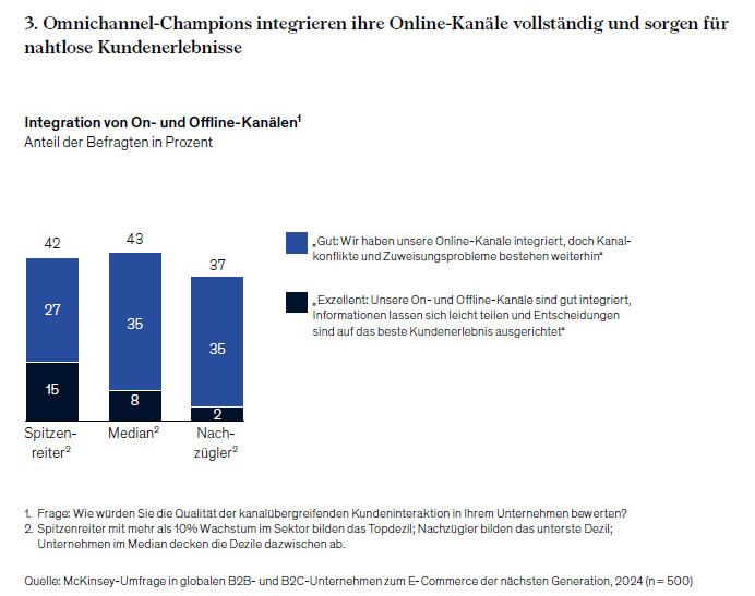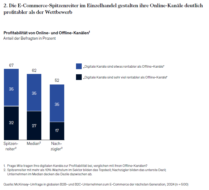 Mehr als 30 Prozent der führenden Unternehmengeben an, dass ihre digitalen Kanäle „sehr viel rentabler“ sind als ihre Offline-Kanäle – fast doppelt so viele wie die Nachzügler. Der Grund: Die Spitzenreiter haben ihr Online-Geschäft technologisch optimiert und setzen auf wirtschaftlich sinnvolle Skalierung. Sie bereinigen kontinuierlich ihre Sortimente und sorgen für einen margenoptimierten Angebotsmix. Sie passen Mindestbestellmengen und Lieferpreis an, senken Lager- und Lieferkosten und trimmen ihr Marketing auf Rendite. Zudem bauen sie eigene Kundendaten auf („First-Party Data“), personalisieren ihr Customer Relationship Management und machen sich unabhängiger von externen Quellen zur Generierung von Reichweite.
