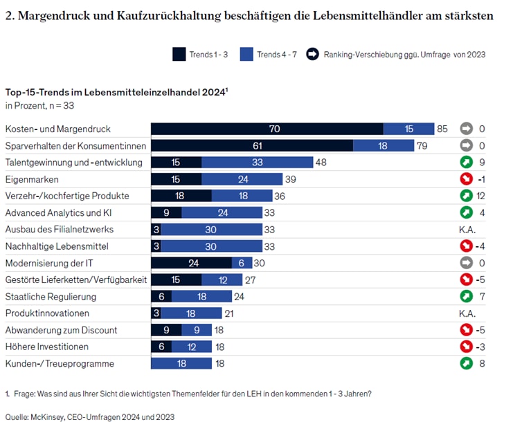 70 Prozent der befragten CEOs geben an, dass Kosten- und Margendruck für sie zu den Top-3-Prioritäten zählen. Die Händler reagieren darauf, indem sie intern weitere Kosten einsparen und unter anderem noch intensiver mit den Lieferanten verhandeln. Damit setzen sie den Trend aus dem Vorjahr fort, der zur Folge hatte, dass einige Produkte des Kernsortiments vorübergehend nicht in den Geschäften erhältlich waren.