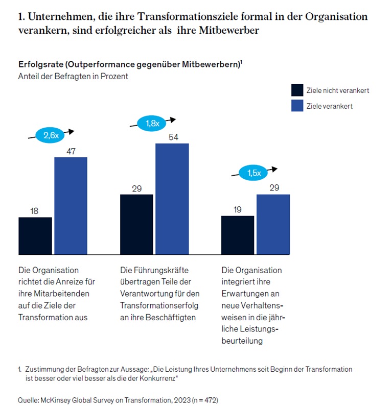 Die formale Verankerung der Transformation in der Organisation erhöht die Erfolgswahrscheinlichkeit ebenfalls signifikant um das Eineinhalb- bis Zweieinhalbfache. Die wirksamsten Hebel sind mit den Zielen verknüpfte Anreize für die Mitarbeitenden, die Übertragung von Verantwortlichkeiten für den Transformationserfolg an alle Beschäftigten sowie die Integration der Zielerwartungen in die jährlichen Leistungsbeurteilungen.