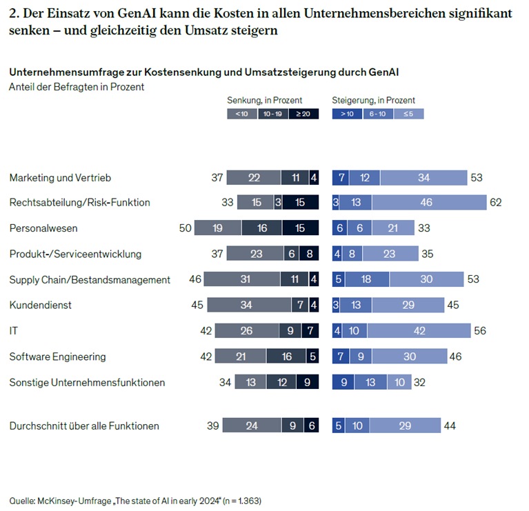 IT-Prozesse. Eine aktuelle Studie belegt weiteres Einsparpotenzial durch GenAI in den IT-Abteilungen. So ließen sich die benötigte Zeit zur Aktualisierung bestehender Software-Codes um 70 Prozent und die Umsetzungsdauer komplexerer Aufgaben um 10 Prozent verkürzen. Die Produktivität der IT-Führungskräfte stieg dadurch um 48 Prozent – die so gewonnene Zeit konnten sie für die Arbeit an strategischen Themen nutzen. Geschwindigkeit spielt eine Schlüsselrolle bei GenAI – auch wenn es darum geht, die Tools in der Organisation zu implementieren. Erfolgreiche Unternehmen verschaffen sich einen kurzen, konzeptionellen Überblick über mögliche Einsatzgebiete entlang der Wertschöpfungskette, um dann zügig zwei bis drei „Speedboats“, also Anwendungsfälle mit hohem Potenzial, zu Wasser zu lassen. Nur so sind schnelle finanzielle Effekte zu erzielen.