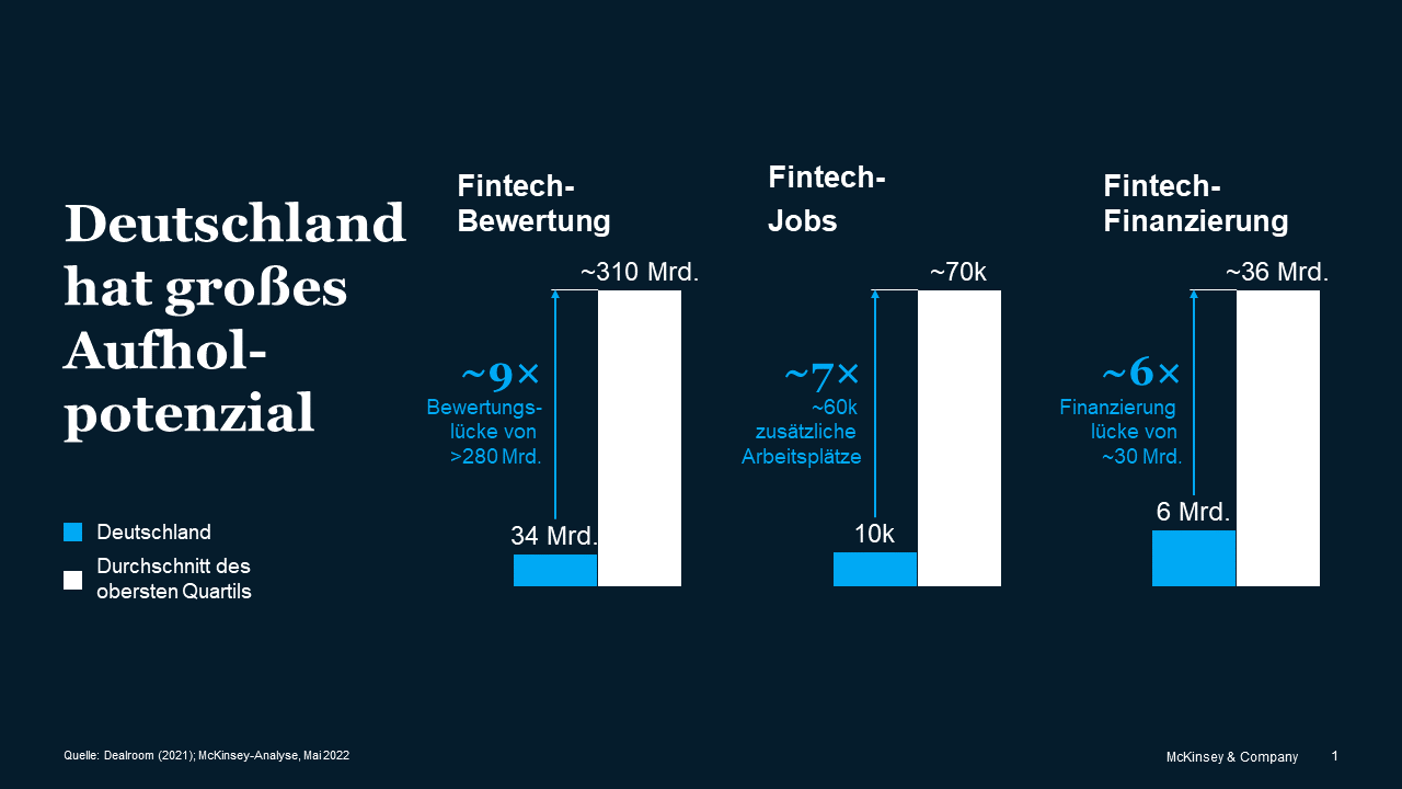 Dabei steckt in Deutschlands Fintech-Ökosystem erhebliches Potenzial: Würde Deutschlands Fintech-Ökosystem u.a. bei Gründungsquote und Investitionen zu Großbritannien, Schweden und den Niederlanden aufschließen, könnte der Sektor den Standort Deutschland wesentlich stärken. Die kumulierte Bewertung des Fintech-Sektors könnte um mehr als 280 Milliarden Euro gesteigert werden. Zudem könnten rund 60.000 Arbeitsplätze der nächsten Generation entstehen - beispielsweise Data Scientists, Expert:innen für digitales Marketing und IT sowie Designer:innen.