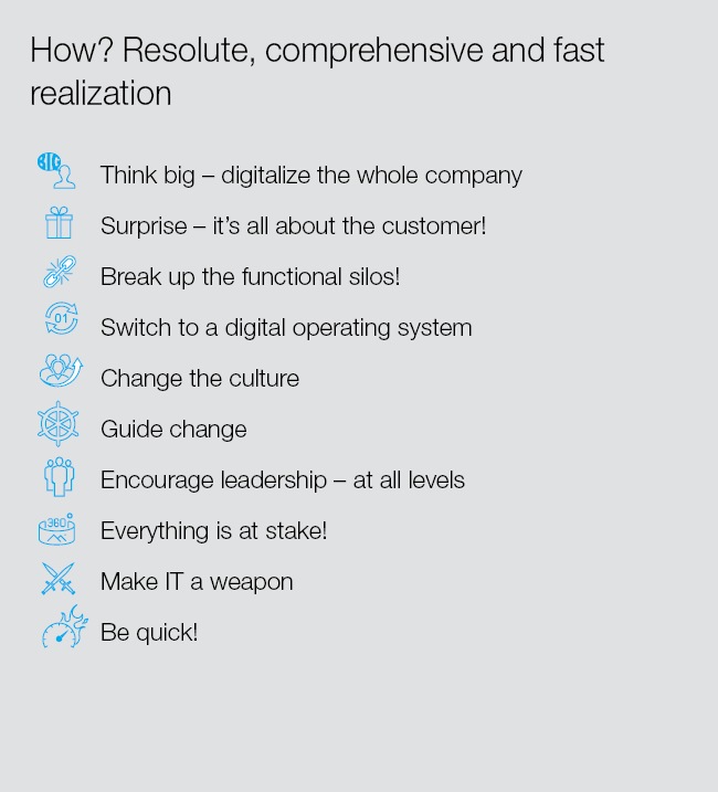 - Further development of business architecture: From customer contact to administration - the entire value added chain needs to be revolutionized.