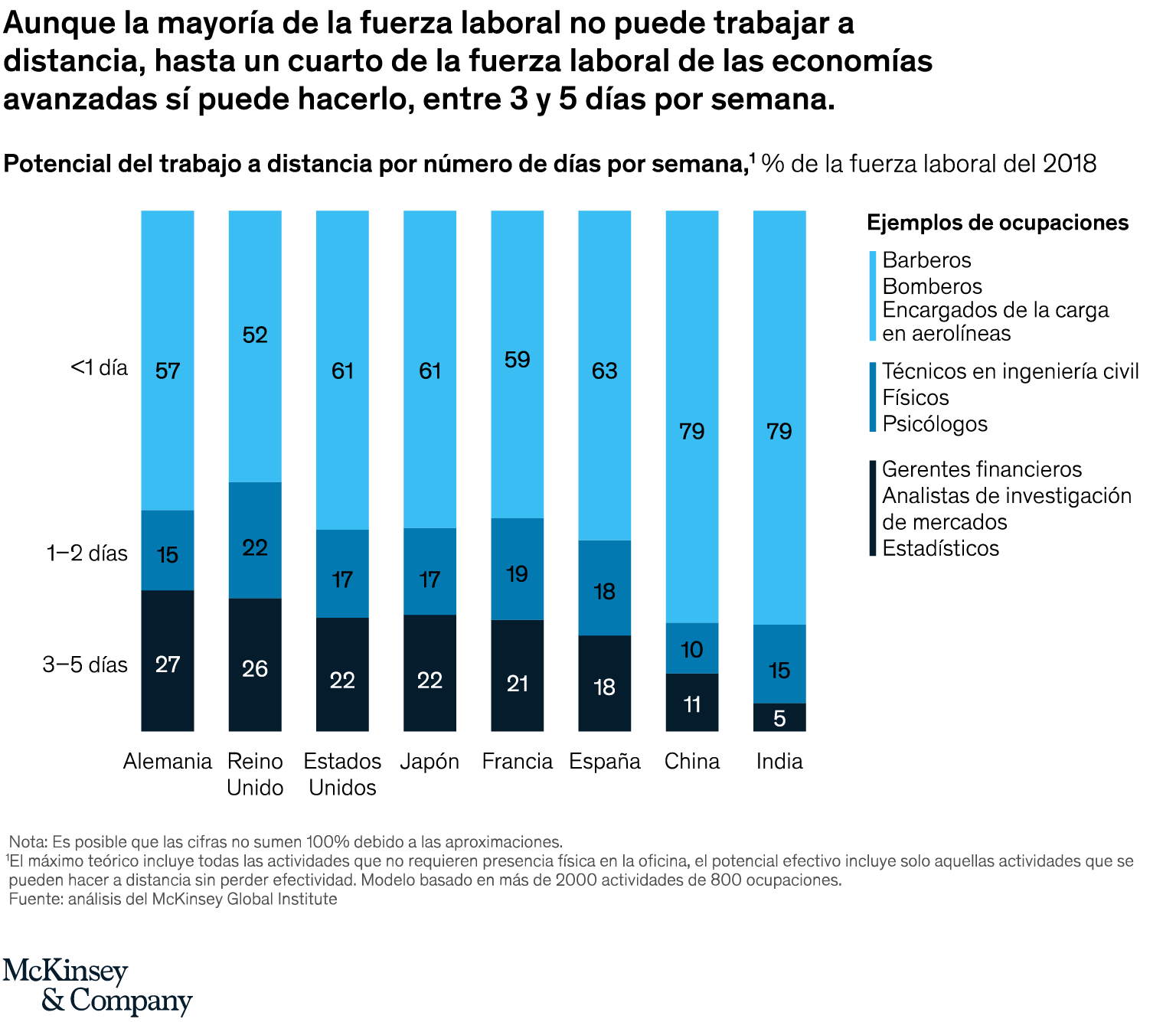 Los colaboradores que podían trabajar a distancia instalaron oficinas en sus hogares, lo cual impulsó la venta de escritorios, sillas de oficina y otro equipo y herramientas para organizar una oficina en casa. Para evaluar el futuro del teletrabajo, analizamos más de 2000 actividades laborales de 800 ocupaciones, con el fin de ver cuáles se pueden realizar desde casa sin perder productividad. Encontramos que entre 20 y 25 por ciento de las fuerzas laborales de las economías avanzadas podían trabajar a distancia sin perder efectividad. Eso corresponde a cuatro o cinco veces la tasa de trabajo en casa que se realizaba antes de la pandemia. Las empresas ya están diseñando planes híbridos de trabajo a distancia, que les brindan la oportunidad de reducir el espacio de oficina. A su vez, esto puede cambiar la geografía del trabajo y los centro urbanos, además de reducir los viajes de trabajo. Calculamos que el 20 por ciento de los viajes de trabajo tal vez nunca vuelvan a realizarse, en la medida en que las reuniones virtuales reemplacen las reuniones en persona.