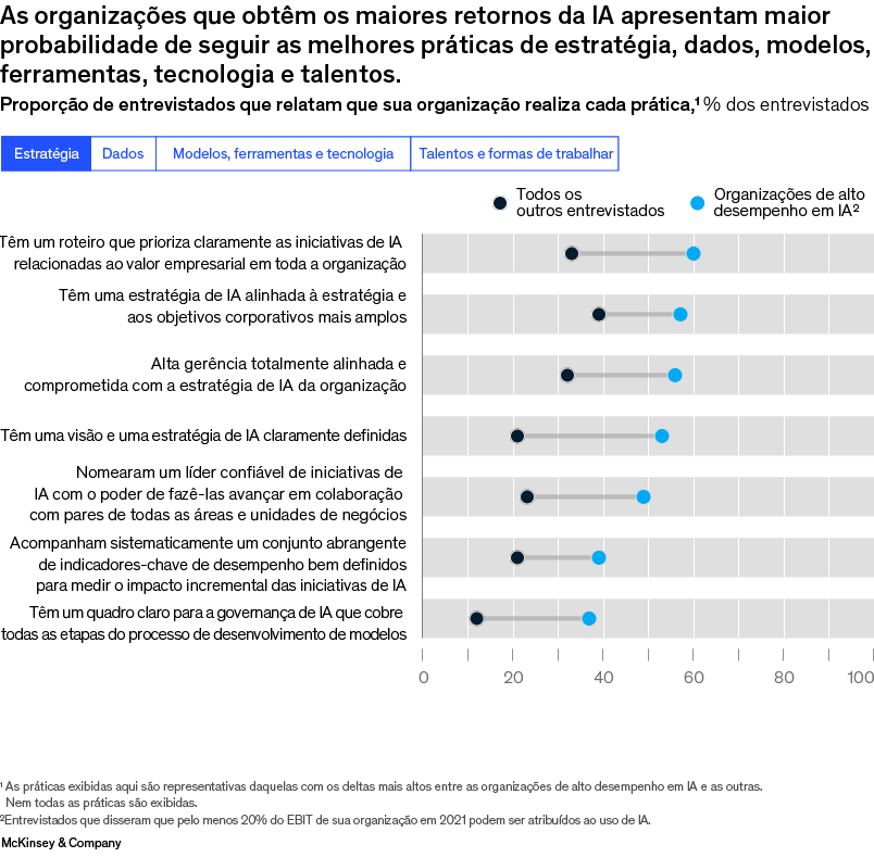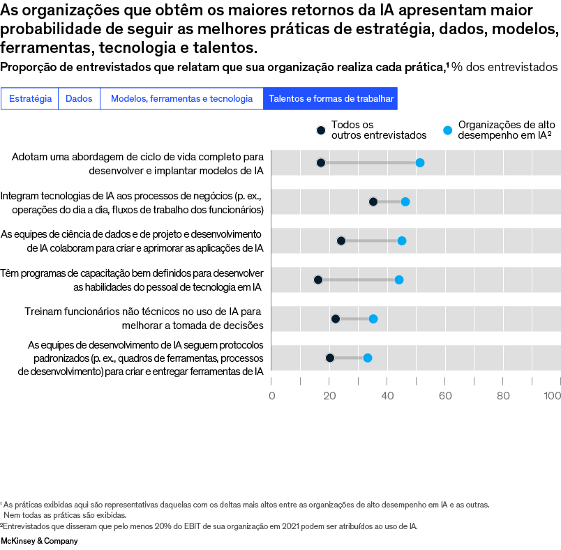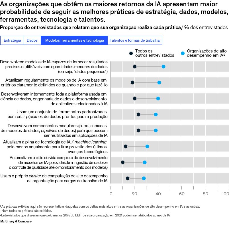 Além disso, as organizações de alto desempenho são mais propensas do que as outras a seguir as principais práticas que liberam valor, como vincular sua estratégia de IA aos resultados de negócios (Quadro 1).2 Outro fator importante é que elas realizam mais frequentemente práticas de “vanguarda” que permitem o desenvolvimento e a implantação da IA em escala, ou o que alguns chamam de “industrialização da IA”. Por exemplo, as líderes apresentam maior probabilidade de ter uma arquitetura de dados modular o suficiente para acomodar novas aplicações de IA rapidamente. Também costumam automatizar a maioria dos processos relacionados a dados, o que pode reforçar a eficiência do desenvolvimento de IA e aumentar o número de aplicações que podem desenvolver, ao fornecerem mais dados de alta qualidade para alimentar os algoritmos de IA. E as organizações de alto desempenho em IA apresentam uma probabilidade 1,6 vez maior do que as outras de envolver funcionários não técnicos na criação de aplicações de IA usando programas novos com pouco código ou sem código, o que permite que as empresas acelerem a criação de aplicações de IA. No último ano, as organizações de alto desempenho apresentaram uma probabilidade ainda maior do que as outras de empregar certas práticas avançadas de escalamento, como o uso de conjuntos de ferramentas padronizadas para criar pipelines de dados prontos para a produção e o uso de uma plataforma completa desenvolvida internamente por elas e voltada ao desenvolvimento de aplicativos, à ciência de dados e à engenharia de dados, tudo relacionado à IA.