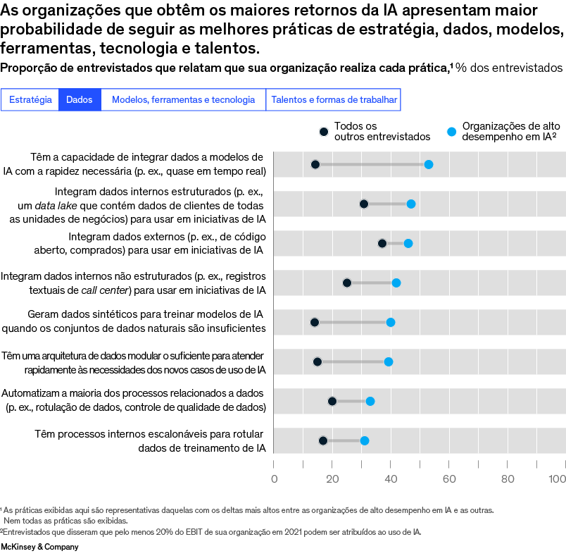 Conclusão: as organizações de alto desempenho já estão bem-posicionados para um sucesso duradouro em IA, maior eficiência no desenvolvimento de nova IA e um ambiente consequentemente mais atraente para os talentos. A boa notícia para as organizações que estão fora do grupo líder é que existe um esquema claro de melhores práticas para o sucesso.