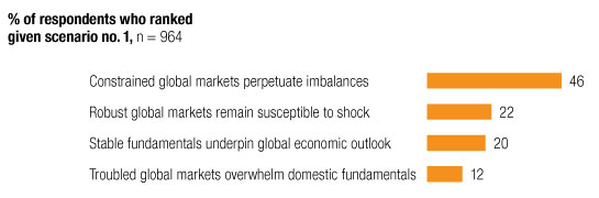 Further, responses to a set of potential scenarios for the future of the global economy indicate significant wariness.2 Nearly half expect that a future in which “constrained global markets perpetuate imbalances” is the likeliest scenario over the next three months (Exhibit 5). Among other elements, this scenario anticipates strength in emerging markets but a failure to repair fundamental economic policies and a weak US consumer sector. This finding is consistent with the view that low consumer demand is the single biggest threat to growth, which is particularly strong among respondents in developed economies; 53 percent of respondents overall say so, and the figures rise to 57 percent in North America and 60 percent in Europe.