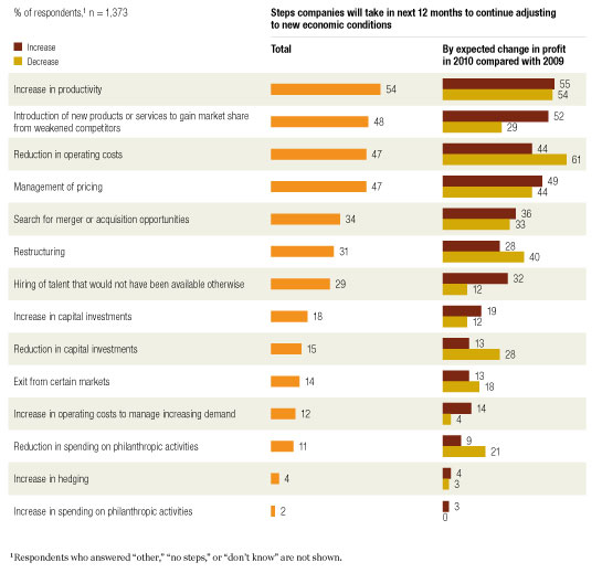 Three-quarters of respondents to our latest survey1 expect their companies to enjoy a profit increase in the next year, and fewer than half expect to cut costs during the same period—both firsts since October 2008, when we began asking. On the whole, this survey shows that executives see economies on the mend, with positive prospects for their countries—84 percent expect national GDP to rise in 2010—as well as for their companies.