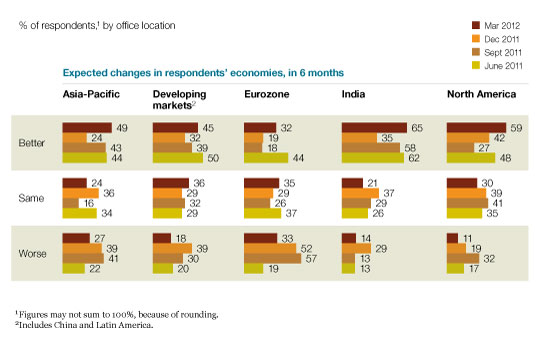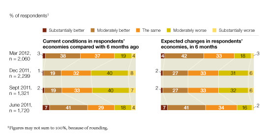 Executives are increasingly positive about current economic conditions at both the global and national levels, according to our most recent survey on economic conditions.1 The future of the eurozone economy remains uncertain—60 percent expect a minimal contraction or recession there within the next six months—but, compared with three months ago, significantly larger shares of executives around the world expect improving conditions in their own countries. Concern about sovereign-debt default as a barrier to growth is down, while worries about commodity prices and geopolitical instability are up since December.