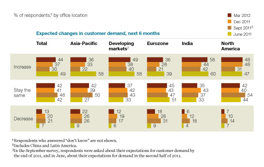 While low demand is still seen as the biggest threat to growth, more respondents expect customer demand to increase than have said so since last June (Exhibit 5), and executives are especially positive in emerging economies. The share expecting their companies’ profits to increase continues to grow: 62 percent say so now, up from 56 percent in December and 45 percent in September. As in December, executives in the eurozone are less positive about profits than elsewhere, but even their overall expectations have improved over time.3