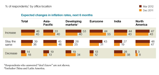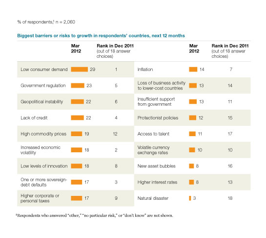 At the global level, concerns about inflation rates have held steady but differ across regions (Exhibit 3). Inflation is cited as a risk to economic growth in respondents’ countries by the same share as three months ago, yet views on other risks have shifted notably since December (Exhibit 4). Low consumer demand still tops the list but is now followed by government regulation, geopolitical instability, and lack of credit; three months ago, volatility and sovereign-debt defaults were in the top three.