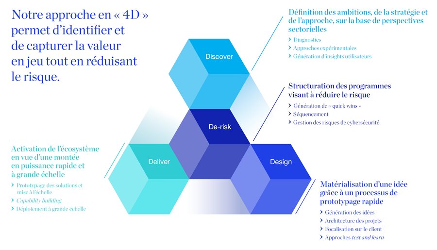 Nous en sommes convaincus, la révolution numérique exige pour la plupart des entreprises de faire évoluer leur business model même. En conséquence, la transition doit se faire par le cœur des activités, et non par la périphérie. Au vu des défis d’une telle mutation, nous l’abordons de façon extrêmement rigoureuse, à travers une des diagnostics sans concession, permettant la définition de programmes ambitieux. Notre approche, qui se décline en « 4D » (Discover, Design, Deliver, De-risk), nous permet ainsi à la fois d’identifier et de capturer la valeur en jeu, tout en réduisant le risque.
