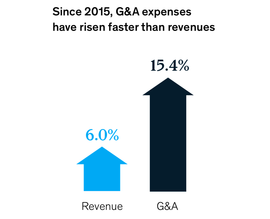 Many companies face growing general and administrative (G&A) costs—a trend the COVID-19 crisis has accelerated. From 2008 to 2015, G&A expenses grew less than revenues (41.8 percent versus 61 percent). Since then, the trend has reversed, with G&A expenses rising faster—15.4 percent compared with 6.0 percent revenue growth.