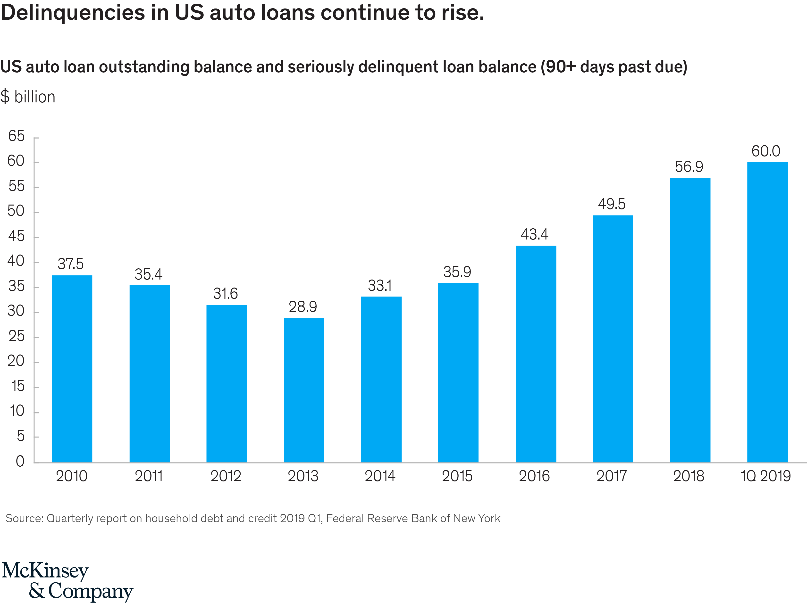 The US auto finance industry is showing signs of distress. Despite reaching an all-time peak of over $1.2 trillion in outstanding balances, there are multiple indicators of potential challenges. The industry is now sitting on its largest share of seriously delinquent loans ever–50 percent higher than at the peak of the recession in 2010,[1] with serious delinquencies representing 4.69 percent of the total outstanding in the first quarter of 2019. All of this is happening while underlying auto sales have been flat over the past few years, due to a variety of factors, including the exhaustion of post-recession pent-up demand, and rising gas prices.