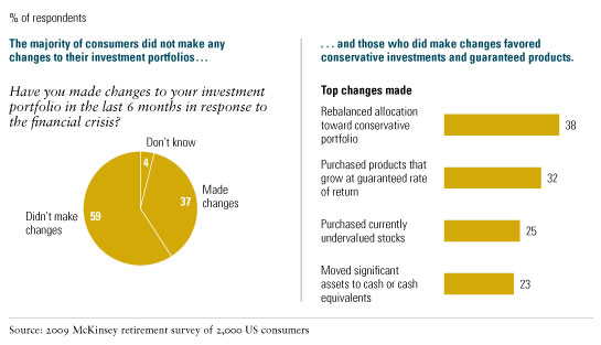 Consumer anxiety about retirement risks has jumped dramatically in the United States as a result of the economic crisis, which last year reduced the value of US household financial assets (excluding real estate) by an average of 18 percent. Yet the vast majority of US consumers haven’t changed their investment portfolios and don’t plan to postpone retirement, according to our nationwide January 2009 retirement survey of 2,000 US consumers. This finding suggests that many of them have not yet figured out how to react to the crisis.