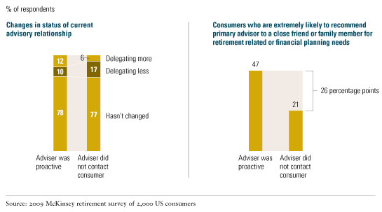 The reason, in part, may be that financial advisers have provided only limited guidance to their clients over the last six months, reaching out to just two in five of them—perhaps fearing an angry response after 2008’s staggering $2.4 trillion decline in the value of retirement assets in defined-contribution accounts and IRAs.1 The overall level of advice from financial advisers fell significantly, compared with 2007. But the best advisers were smarter: they reached out systematically and proactively even to clients with significant losses. The results, according to our survey, were significantly strengthened relationships, referrals, and asset flows.