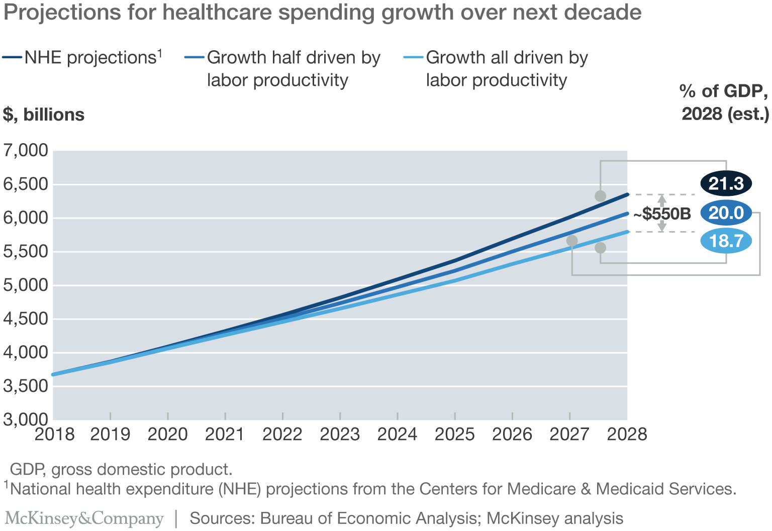 The impact of improving productivity would be profound. Our conservative estimates suggest that if the healthcare delivery industry could rely more heavily on labor productivity gains rather than workforce expansion to meet demand growth, by 2028 healthcare spending could potentially be (on a nominal basis) about $280 billion to $550 billion less than current national health expenditures (NHE) projections suggest (Exhibit).3 Cumulatively, $1.2 trillion to $2.3 trillion could be saved over the next decade if healthcare delivery were to move to a productivity-driven growth model. Savings of this magnitude would bring the rise in healthcare spending in line with—and possibly below—GDP growth. In addition, the increased labor productivity in healthcare delivery would boost overall US economic growth at a faster rate than current projections—an incremental 20 to 40 basis points (bps) per annum—both through direct economic growth and the spillover impact of greater consumption in other industries. However, meaningful action by, and collaboration among, all stakeholders will be needed to deliver this value.