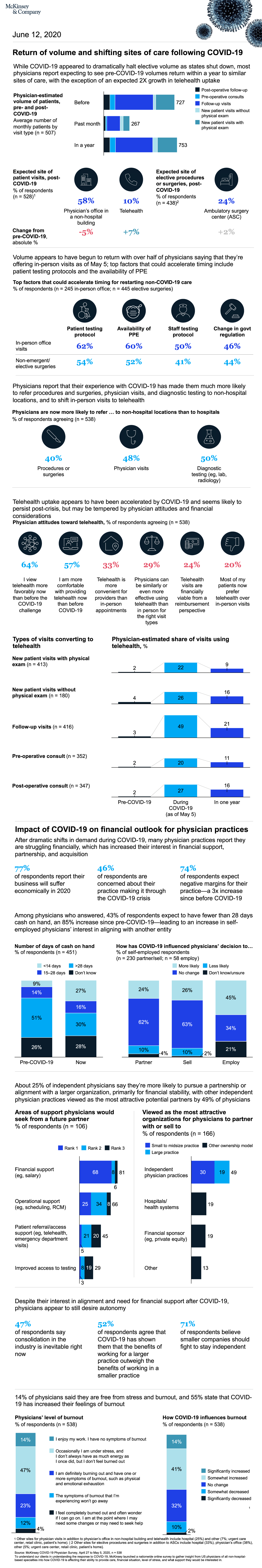 The COVID-19 pandemic continues to be on the forefront of physicians’ minds as a humanitarian crisis. As these healthcare providers seek to deliver safe care to patients, they also are examining how to maintain their practices’ financial stability. In McKinsey’s Physician Survey, conducted in May 2020, physicians said they were now more likely to refer procedures and surgeries, physician visits, and diagnostic testing to non-hospital locations and to shift in-person visits to telehealth. Roughly a fourth of independent physicians say they are now more likely to pursue alignment with a larger organization, preferably another independent physician practice, to obtain financial and operational support. COVID-19 has also increased physicians’ feelings of burnout.