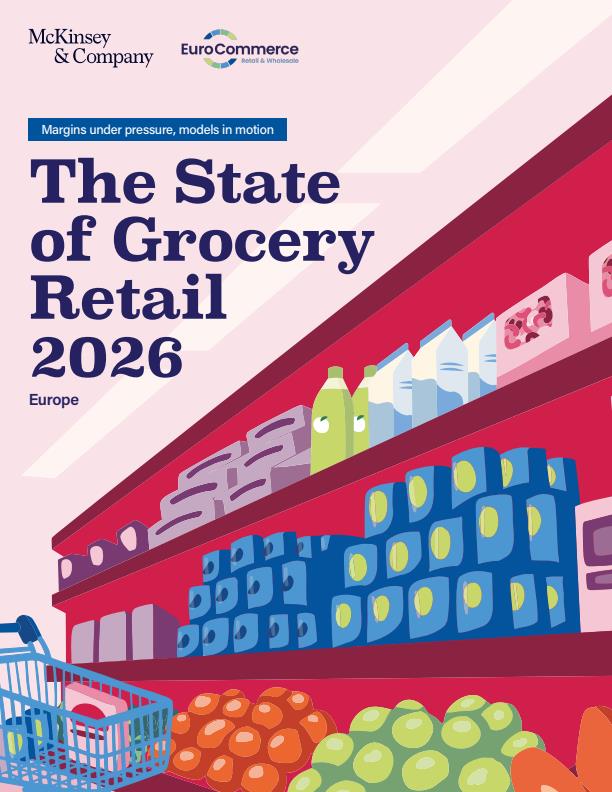 The year 2025 was characterized by low-growth stabilization under sustained profitability pressure. In Europe,1 grocery sales grew by 3.4 percent—consumer prices continued to increase moderately by 2.9 percent, while volume grew by 0.6 percent, with marginal downtrading at –0.1 percent.2 While cost and margin pressure remained the top concern for CEOs, overall executive sentiment improved, with a majority expecting market conditions to remain stable or improve. Consumer behavior also showed emerging markers of stabilization, with only limited shifts in spending patterns compared to 2024—private label continued to gain relevance, reaching a 40 percent share, while growth of online shopping decelerated.