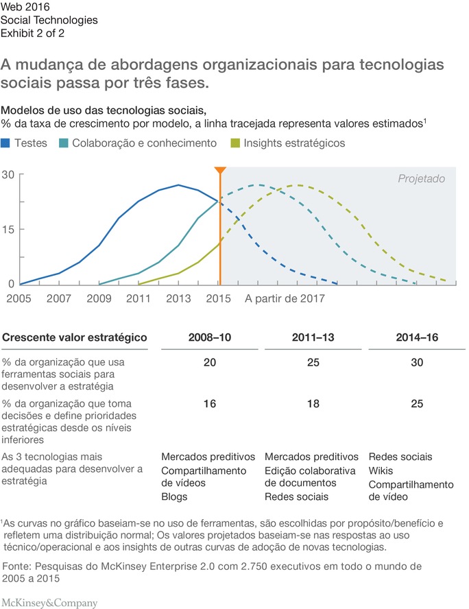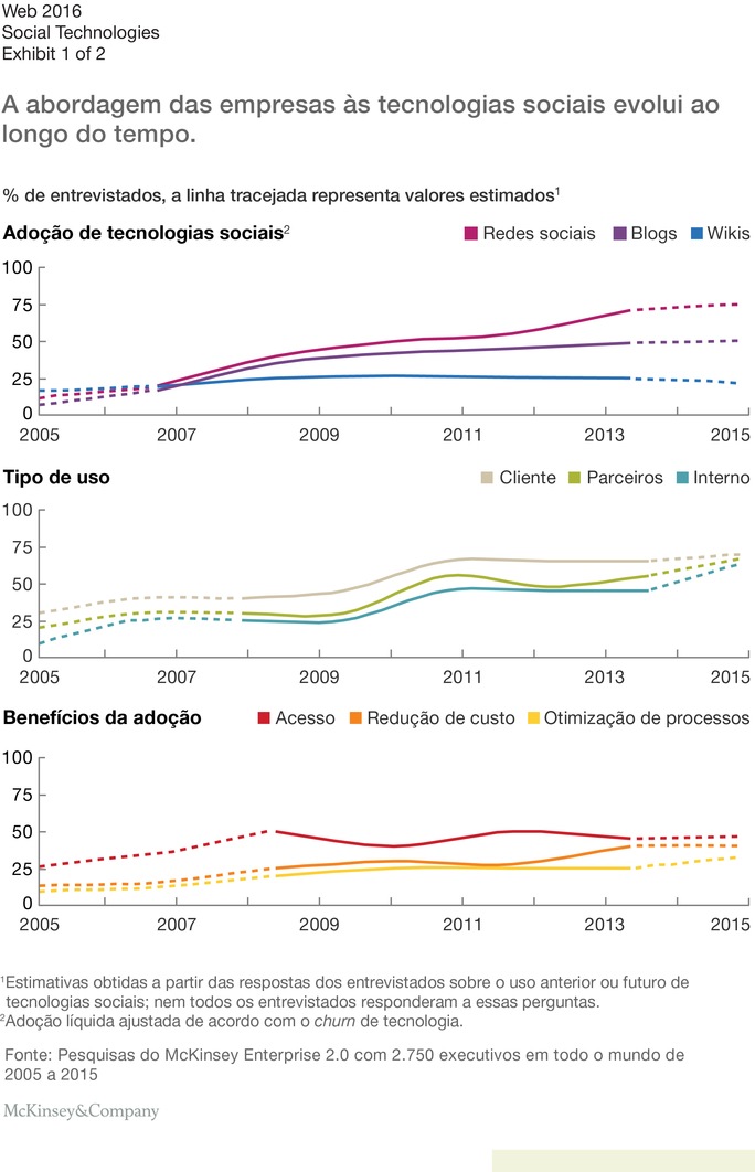 A extensa pesquisa da McKinsey sobre o uso de tecnologias sociais pelas empresas fornece uma vantagem única ao analisar a natureza e o ritmo desta evolução. Pesquisas com mais de 2.700 executivos globais ao longo dos últimos 10 anos comprovaram a disseminação da tecnologia entre as organizações e os padrões para adotá-la.1