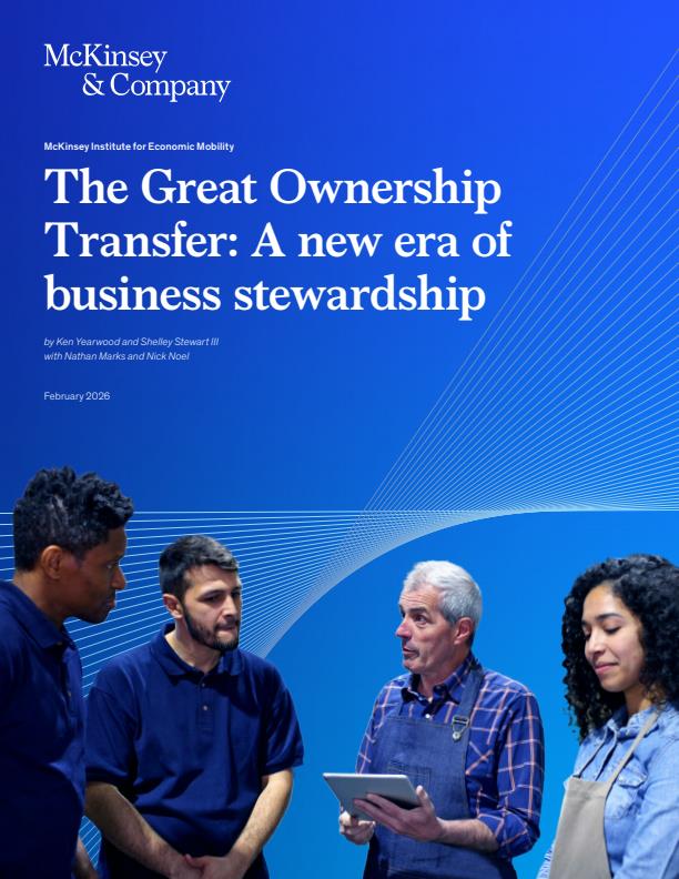 To better understand what’s at stake, the McKinsey Institute for Economic Mobility (IEM) has conducted new research on the future of small-business succession in the United States. By 2035, we estimate that about six million SMBs will be on the market as their owners retire. More than one million of these firms are viable candidates for sale or employee ownership, representing $5 trillion in enterprise value that could remain productive if ownership transfer becomes routine rather than exceptional (see sidebar, “About the research”).