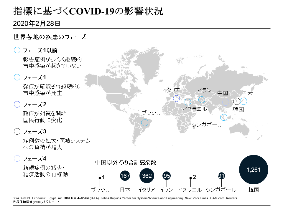 COVID-19は2020年2月24日の週に転換点を迎えた。中国以外の症例数が中国国内を初めて上回り、2月29日時点で54ヵ国で症例が報告されている。アウトブレイクは4つの感染集中地域である中国(湖北省周辺)、東アジア(韓国と日本周辺)、中東(イラン周辺)、西欧(イタリア周辺)で頻発している。合計すると、影響を強く受けている国だけで世界経済の約40パーセントを占めている計算になる。人々の日々の移動に加えて感染集中地域での人々の接触が膨大な数に及ぶことを考慮すると、COVID-19を封じ込めることができる可能性は低い。並外れた公衆衛生対策を行っている中国では状況は安定しつつあるが、中南米(ブラジル)、米国(カリフォルニア、オレゴン、ワシントン)、アフリカ(アルジェリアとナイジェリア)など他の地域でも新規感染数が上昇している。米疾病予防管理センター(CDC)では米国でも市中感染が起きること、あるいは既に発生済みの兆候があるとの明確な予測を打ち出しつつある。