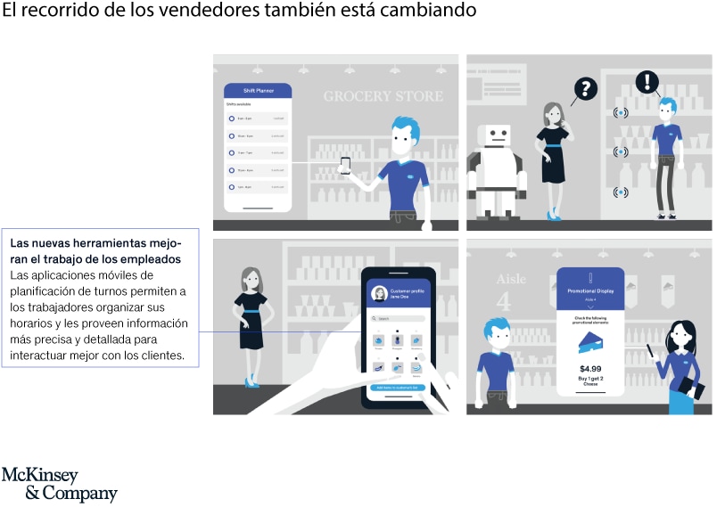 La tecnología no solo reformulará la experiencia del cliente en las tiendas del mañana: trabajar en el sector de retail también será muy diferente (Exhibit 2):
