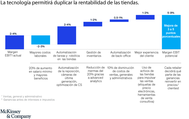 En general, creemos que la tienda del futuro podría generar márgenes de ganancias antes de intereses e impuestos equivalentes al doble de los actuales, con los beneficios agregados de una mejor experiencia del cliente, empleados más motivados y tiendas más fáciles de operar (Gráfico 3). La tecnología necesaria para lograr esta transformación en los resultados ya está disponible, y con un retorno de la inversión positivo de acuerdo a nuestros cálculos.