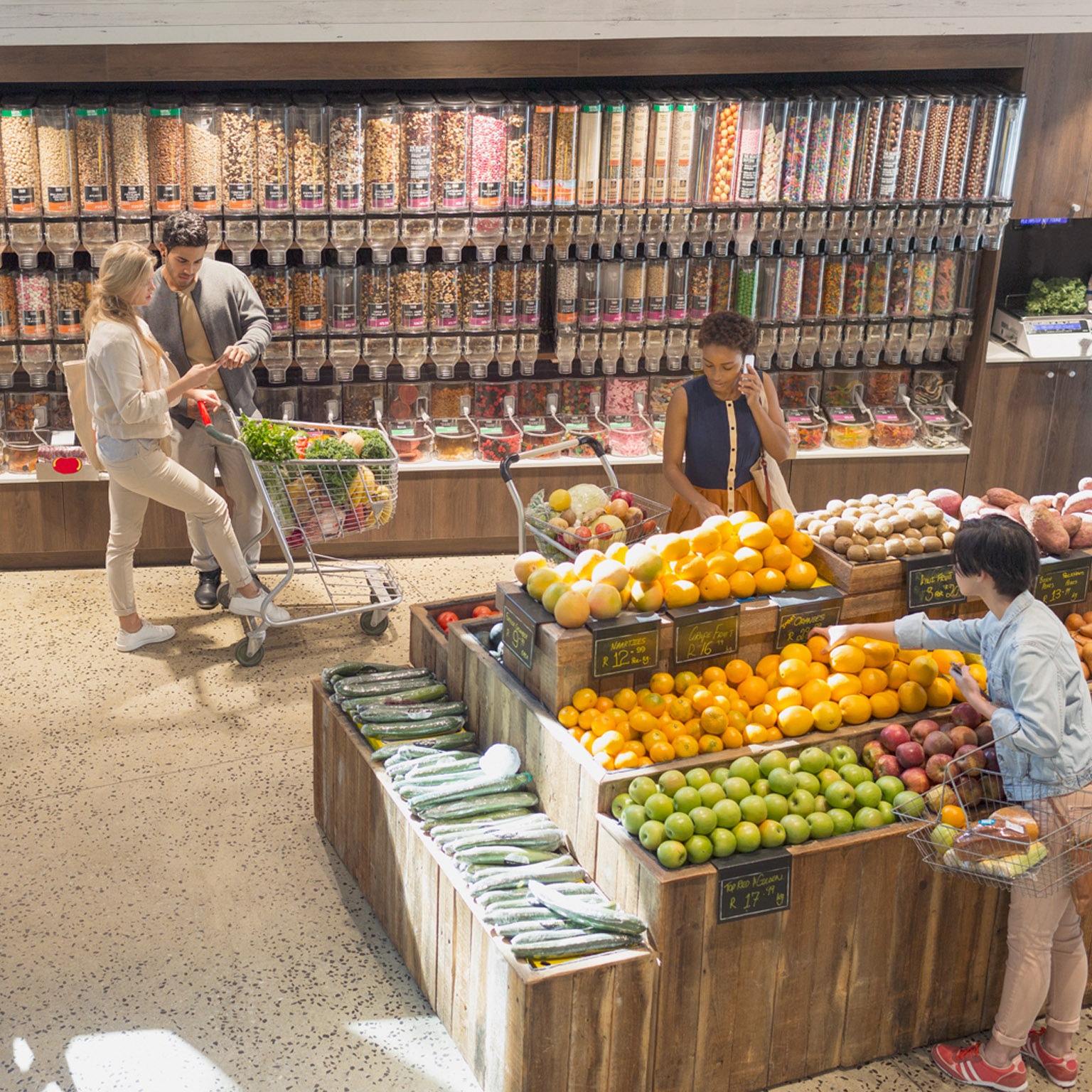 Jonathan arriba a su tienda de alimentos favorita, y ésta lo reconoce cuando su teléfono se conecta a su red de Wi-Fi o quizás gracias a una tecnología de reconocimiento facial a la que el cliente adhirió. Luego de aceptar el inicio de sesión, la tienda accede a la lista de compras que Jonathan preparó en su casa escaneando los productos con su teléfono a medida que se agotaban. Mientras recorre los pasillos, exhibidores inteligentes se iluminan para mostrarle la localización exacta de los artículos, además de ofertas destacadas, artículos complementarios o compras habituales no incluidas en la lista.