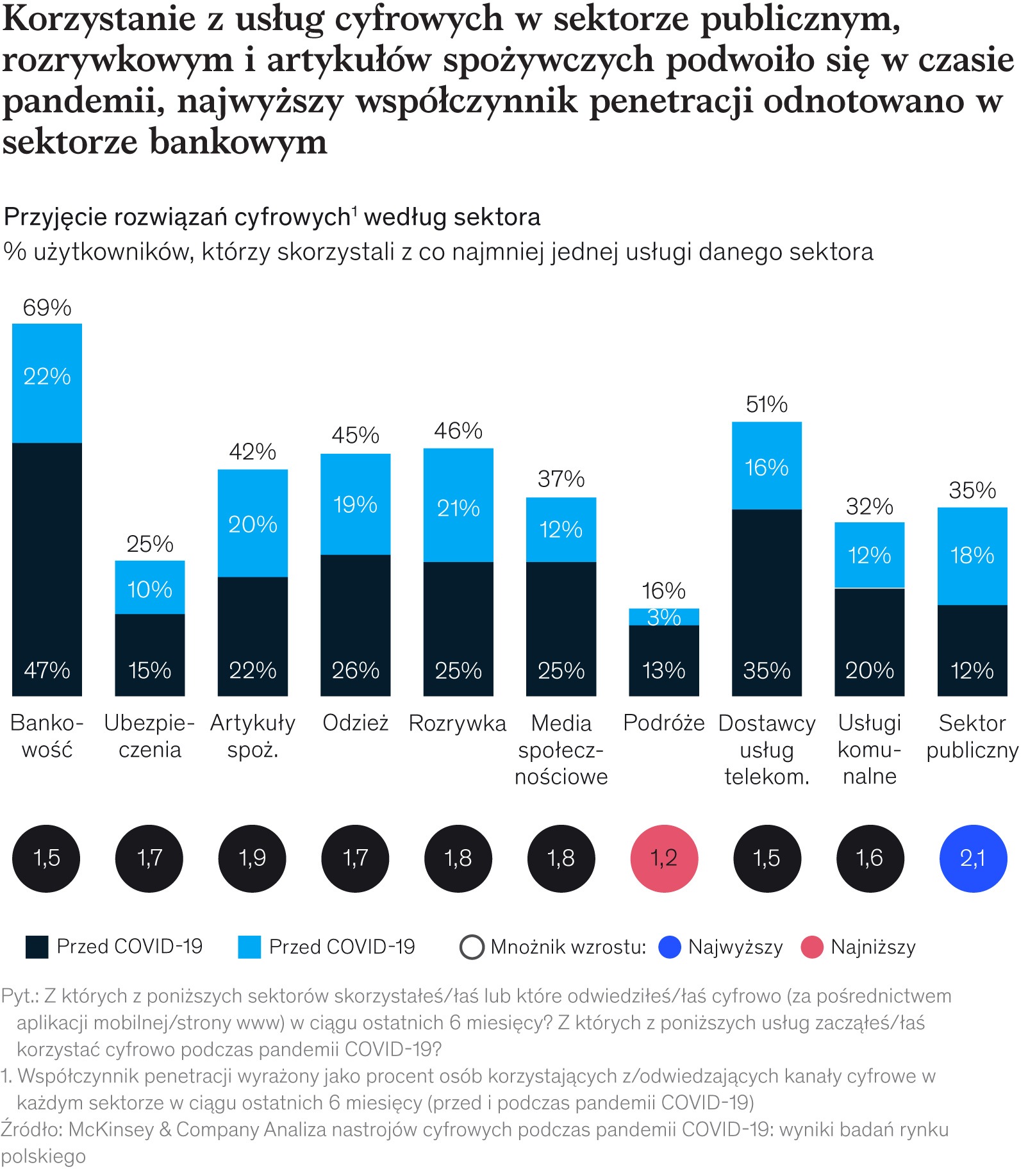 Do najpopularniejszych cyfrowych usług należą bankowość internetowa (korzysta z niej 69 proc. konsumentów) oraz usługi telekomunikacyjne (51 proc.). Nie jest to zaskoczeniem, jako że te dwa sektory inwestowały w cyfryzację jeszcze przed pandemią.