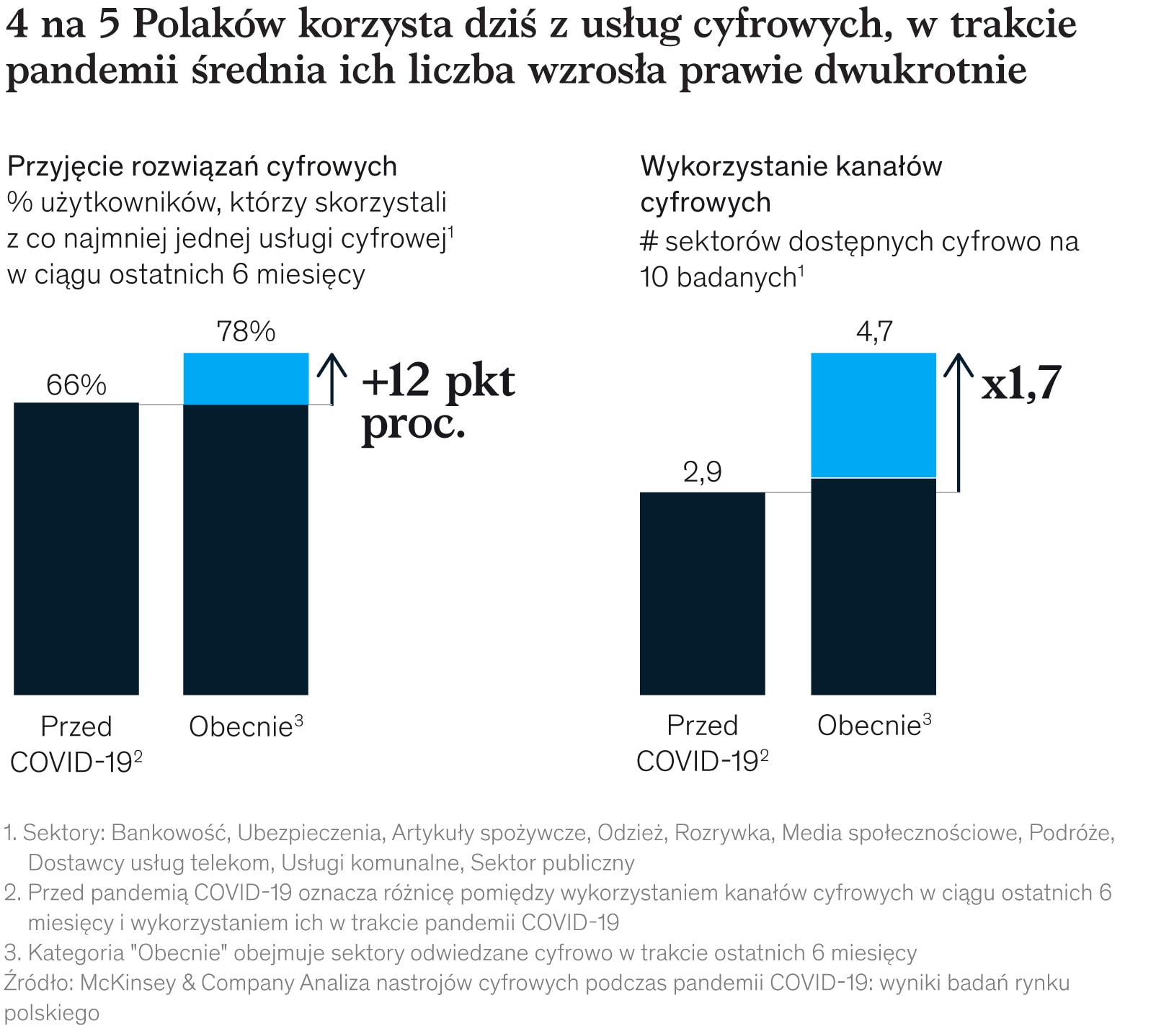 W Polsce liczba osób, które skorzystały z co najmniej jednej usługi internetowej, wzrosła od początku pandemii z 66% do aż 78% – wynika z najnowszej analizy McKinsey & Company. To oznacza około 3,6 mln nowych użytkowników usług cyfrowych.