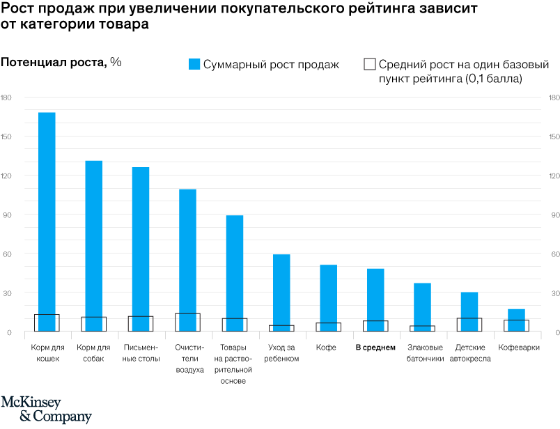 Все понимают, что между онлайн-рейтингом товара и продажами есть связь. Но мало кто пытается точно определить, в какой степени увеличение рейтинга влияет на рост продаж. Мы проанализировали динамику рейтингов и продаж 70 продуктовых категорий на одной из крупнейших площадок онлайн-торговли в течение двух лет, и в 55 из них наблюдалась положительная корреляция между рейтингом и ростом продаж. У товаров с рейтингом от 3 до 4 (по пятибалльной шкале — от 1 до 5 «звезд») объем продаж был в три раза выше, чем у товаров с рейтингом 1. Мы нашли положительную корреляцию между увеличением рейтинга и ростом продаж в 55 категориях, но потенциал роста сильно зависит от категории (см. рисунок).
