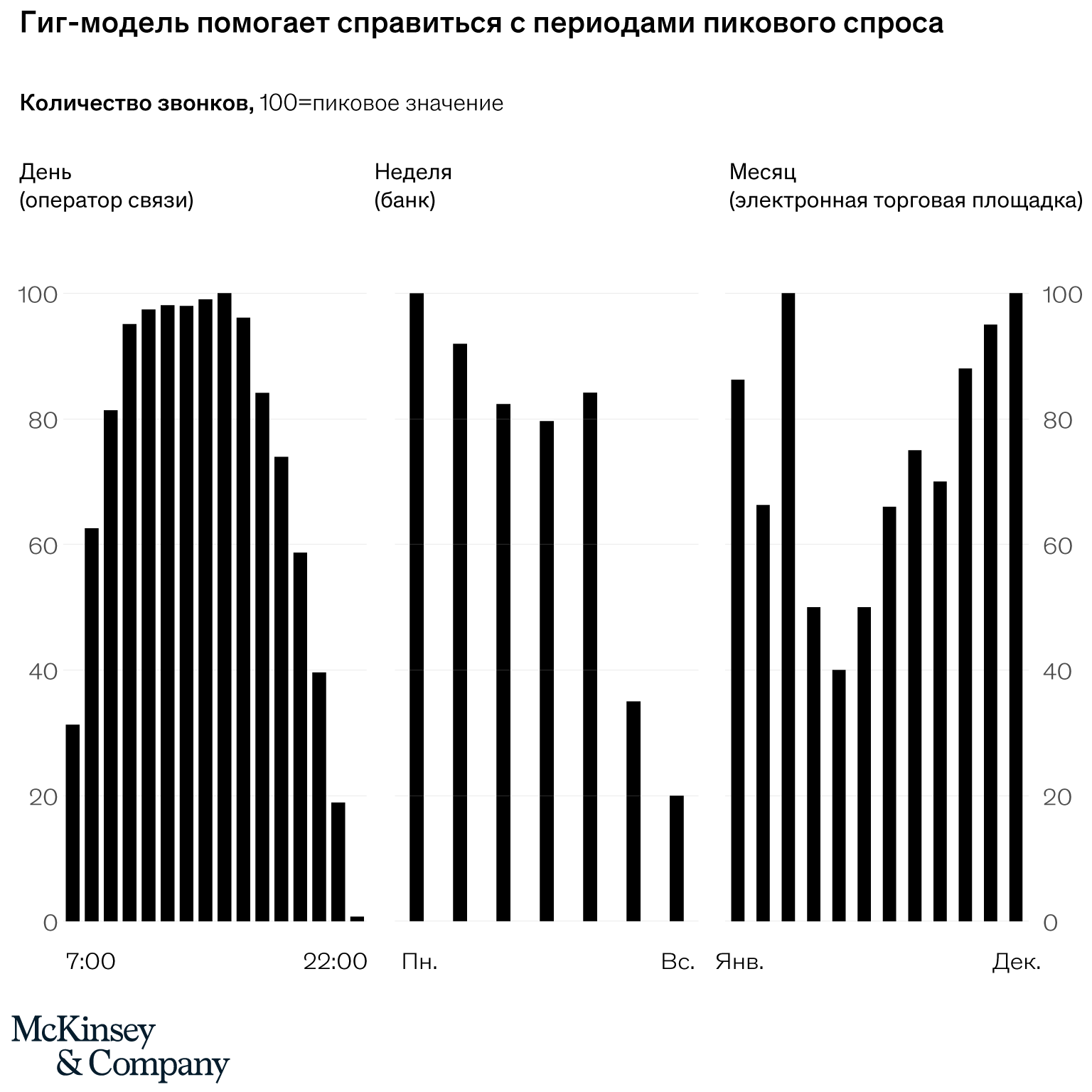- Правильная стратегия. Она должна учитывать флуктуации спроса на разных временных горизонтах (см. рисунок). Также важно четко обозначить, как гиг-модель будет масштабироваться в разных департаментах и применительно к разным продуктам.
